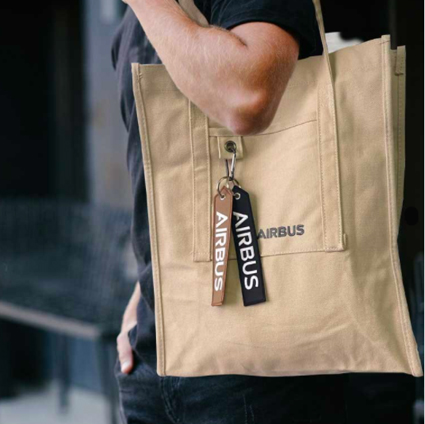 Airbusin eksklusiivinen kassi, valmistettu GRS-sertifioidusta 450 g/m² kierrätetystä puuvillasta, yksi tasku edessä ja toinen vetoketjullinen tasku sisällä. Mukana kaksi karabiinia.