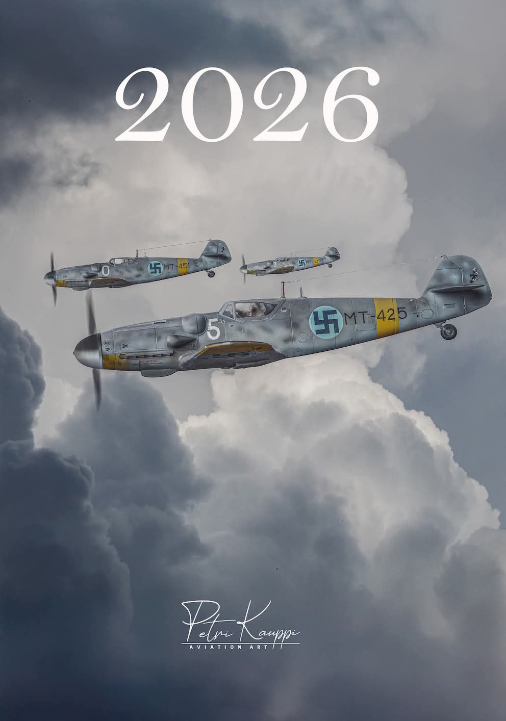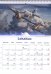 Kalenterissa joka kuukaudelle oma värikuva Suomen Ilmavoimien koneista 2. maailmansodassa. Koko A3, kierrekampa. Suomalaiset nimipäivät.