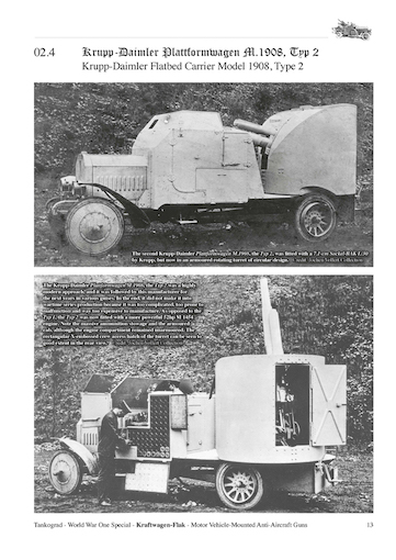 This publication deals in depth with, for the first time ever, the Kraftwagen-Flak motor vehicle-based anti-balloon and anti-aircraft artillery of the Kaiserreich. Lavishly illustrated with contemporary photographs, this book tells the story from pre-war prototypes through to active service during the war years, and even into the post-war Freikorps and Reichswehr periods. Additional chapters cover Kraftwagen-Zugflak motor vehicle-towed trailer-mounted and Raupenflak tracked carrier-mounted anti-aircraft artillery.