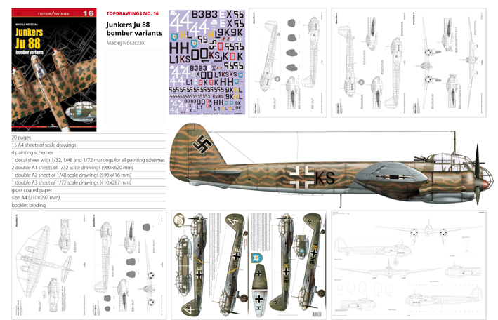 The sixteenth issue of the Topdrawings series is dedicated to the bomber variants of the Junkers Ju 88. It contains scale drawings of all subvariants of the A-variant. Also included are colour profiles of 4 aircraft:
